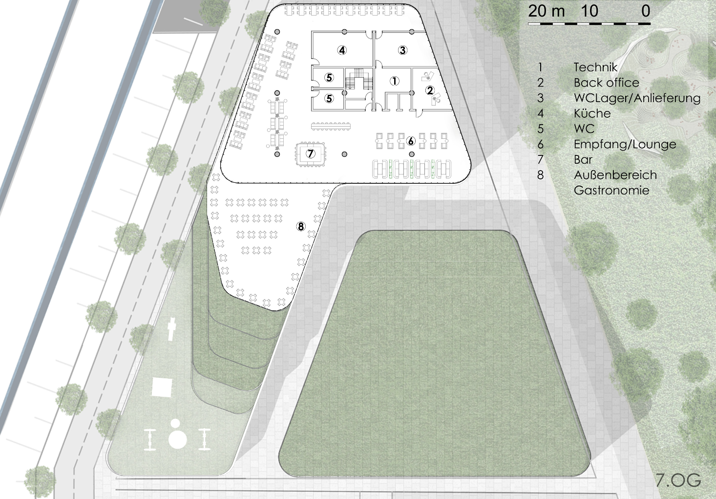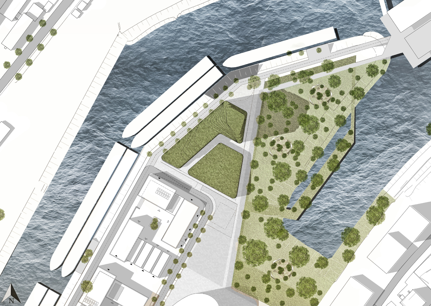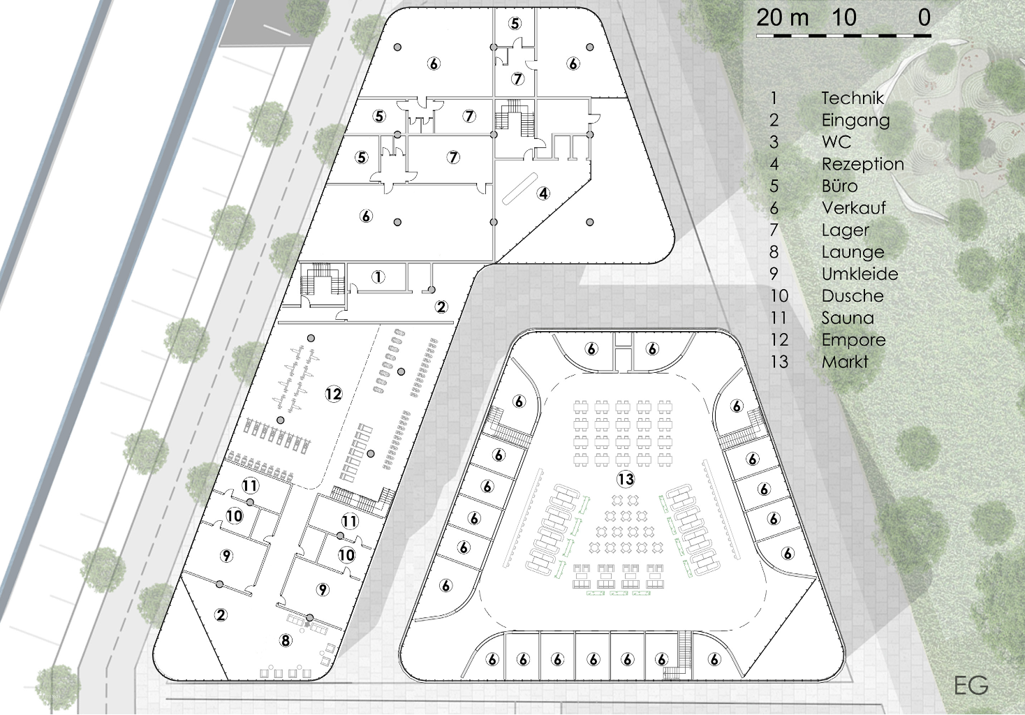 office building in düsseldorf next to the rhine river with a secondary building for a market-/ concert hall.